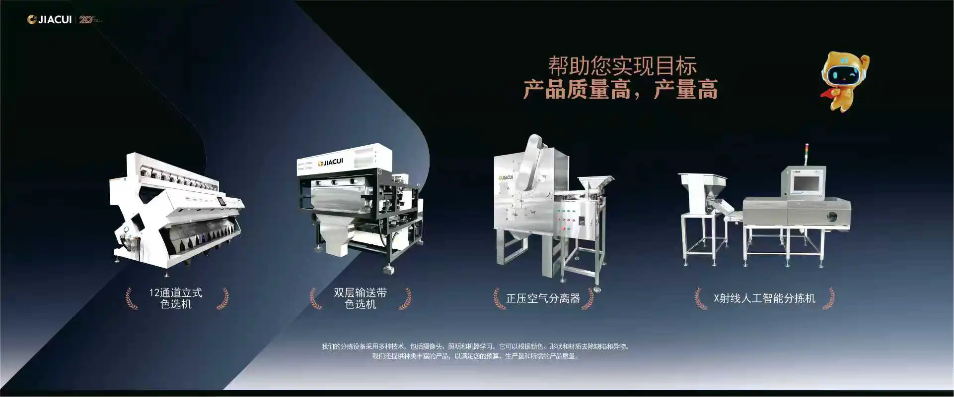 郑州嘉萃机械设备有限公司是一家技术驱动型企业,专注于高端色选设备的研发、生产与销售。凭借对创新与品质的坚定承诺,我们已成为全球企业信赖的合作伙伴。